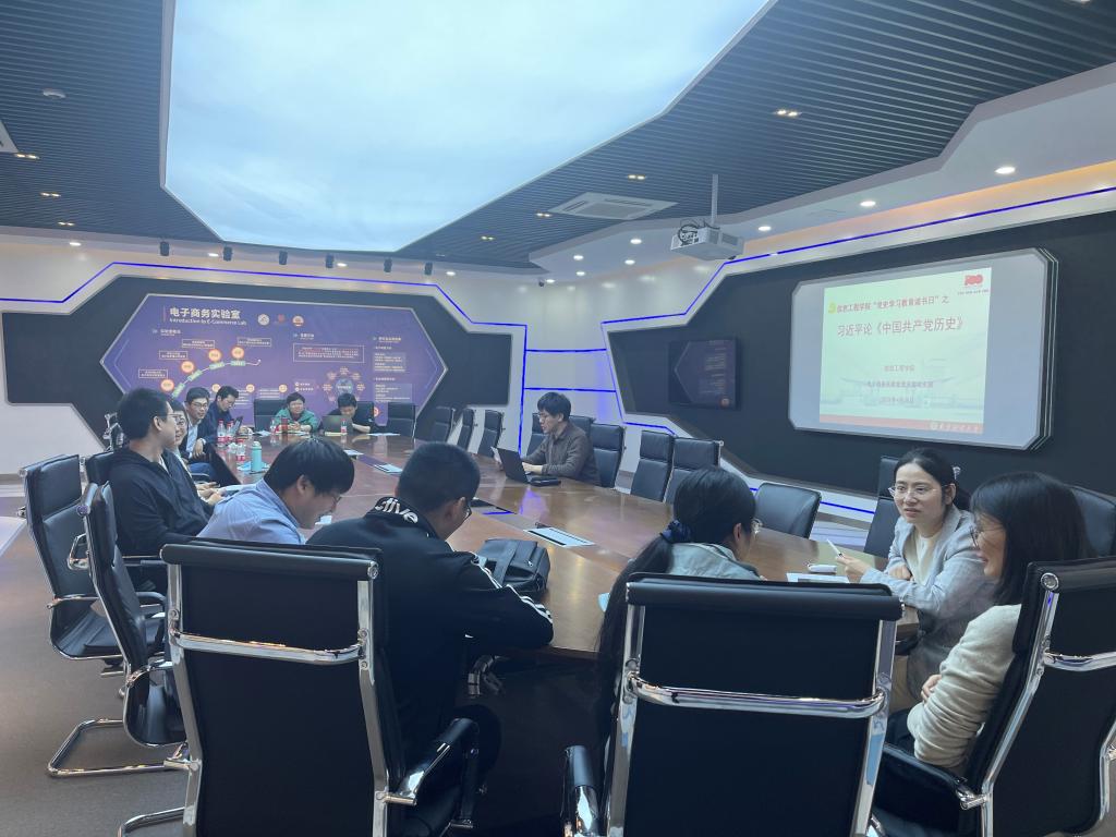 下属各党支部分别在相应的会议室、教室进行集中学习、研讨。各支部均安排相关党员同志进行领学,随后各支部就当日学习内容展开热烈研讨,电子商务实验室党支部蒋伟伟说:“今天的学习系统回顾了我们党团结带领中国人民不懈奋斗的光辉历程,深入总结党在各个历史时期创造的理论成果、积累的宝贵经验、铸造的伟大精神,让我收获匪浅,今后我们将沿着党的光辉历程继续前进,以优异成绩迎接党的100周年。”研究生党支部丁达同学分享了他对于党史学习的感悟:“看了领学同学介绍的西柏坡革命故事,我深刻的明白当时的共产党处境有多么的艰难,今天中国的成就来之不易,没有共产党就没有现在的中国!”