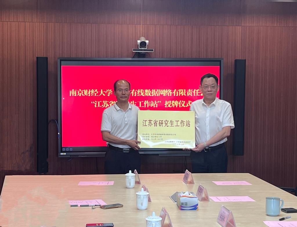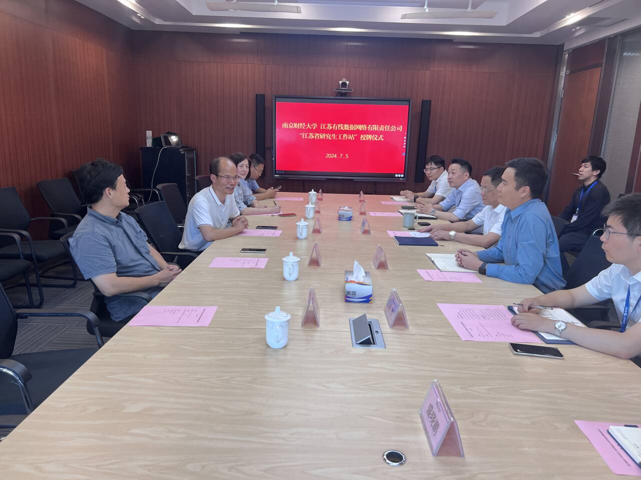 院长黄健、副院长马福民、李树青和院长助理毛波等一行前往江苏有线数据网络有限责任公司(以下简称“江苏有线数据公司”)为双方获批共建的“江苏省研究生工作站”授牌。江苏有线数据公司党委书记、总经理宋晶科,党委委员、副总经理林峰等领导出席。授牌仪式取得圆满成功。