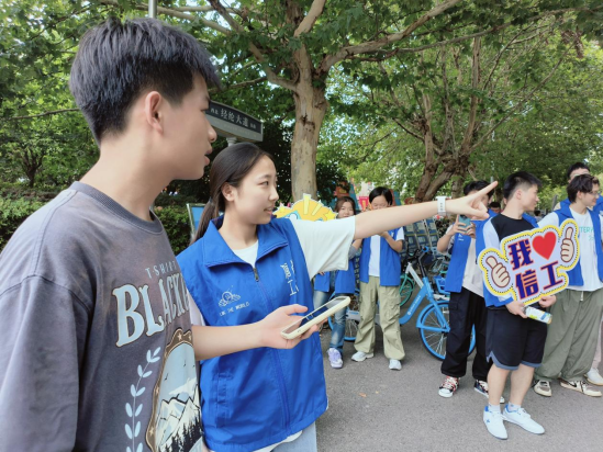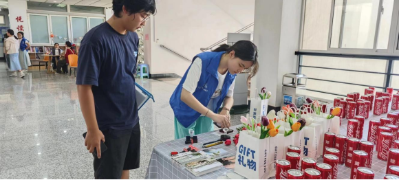精心准备的礼物,传递幸运与快乐。新生们收到印有自己姓名和“我爱信工”字样的定制可乐、郁金香花等,欣喜不已,伴随着志愿者的美好祝福,接过集章卡,执笔在明信片上写下未来展望,于参与活动途中盖上各色印章,留下载满期许与活力的新足迹。