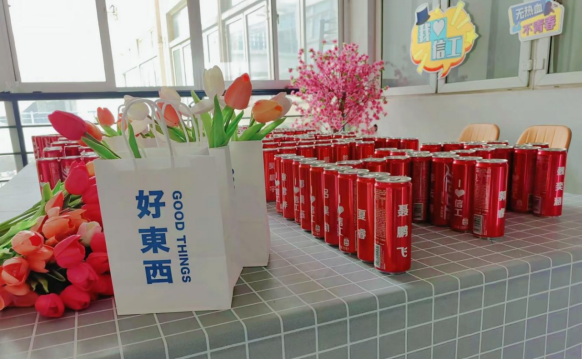 印制的含有新生姓名和“我爱信工”字样的定制可乐、郁金香花
