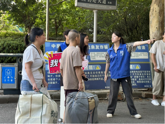 迎新志愿者正在宿舍区开展迎新志愿服务工作