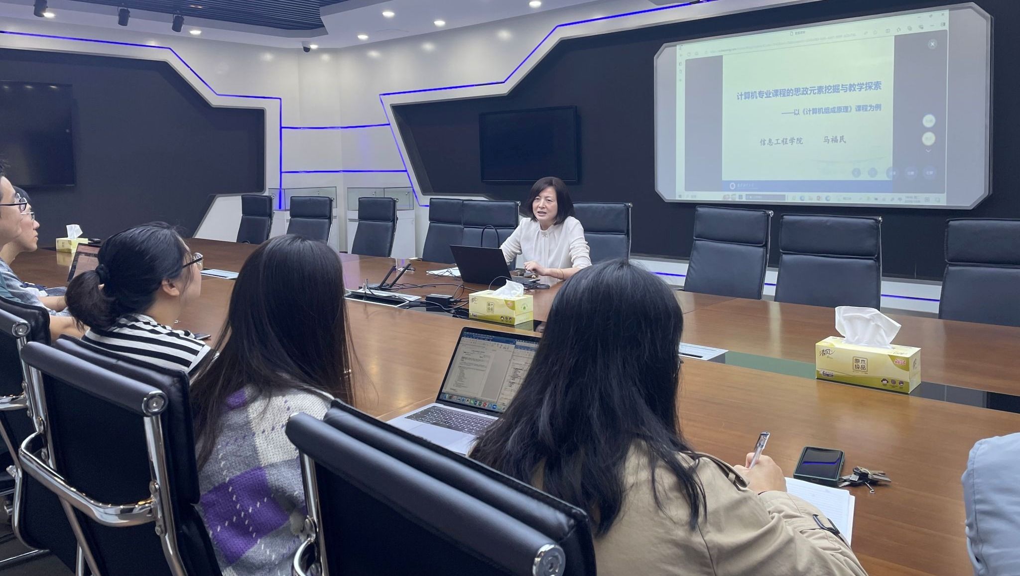 课程思政建设指导纲要》进行了详细解读,帮助老师们更好地理解课程思政建设的指导思想、基本原则和主要任务,详细阐述了计算机专业课程不可或缺的思政元素:爱国主义情怀与大国工匠精神、专业伦理意识、科学道德素养、哲学思想与元素。其次,以《计算机组成原理》课程思政教学为例,详细介绍了该课程在课程思政方面的设计理念、实施策略以及取得的成果,分享了案例库建设及课堂教学设计的经验。通过生动的案例和具体的教学实践,让青年教师对课程思政建设有了更加深入的理解和认识。教学方法上融合启发式教学和分组式案例教学,“以专业知识涵养思政教育,以思政教育激活专业知识”,做到润物细无声,以培养学生强建“中国芯”为核心,以及如何做到课堂知识和思政的巧妙结合进行了经验分享。