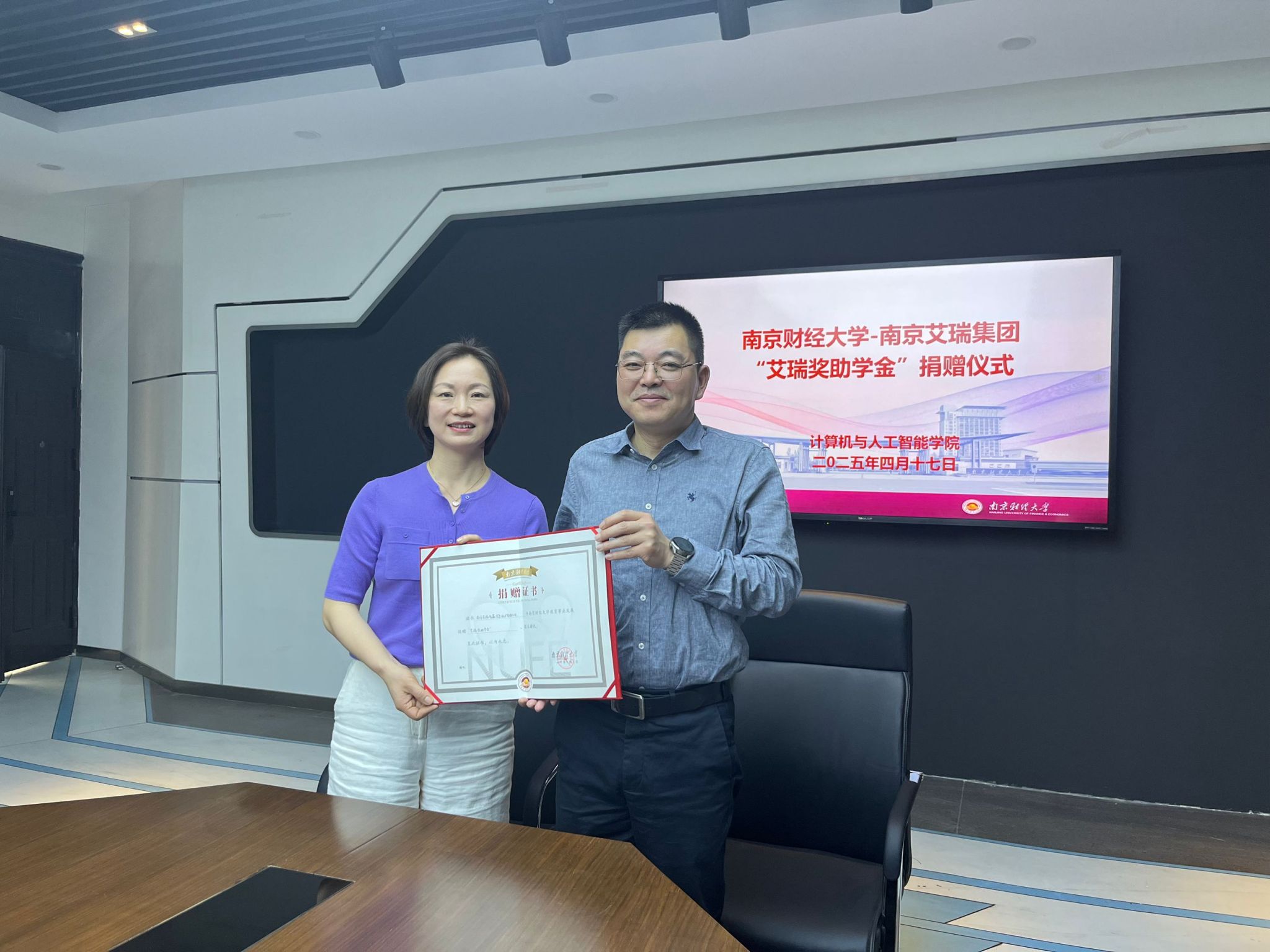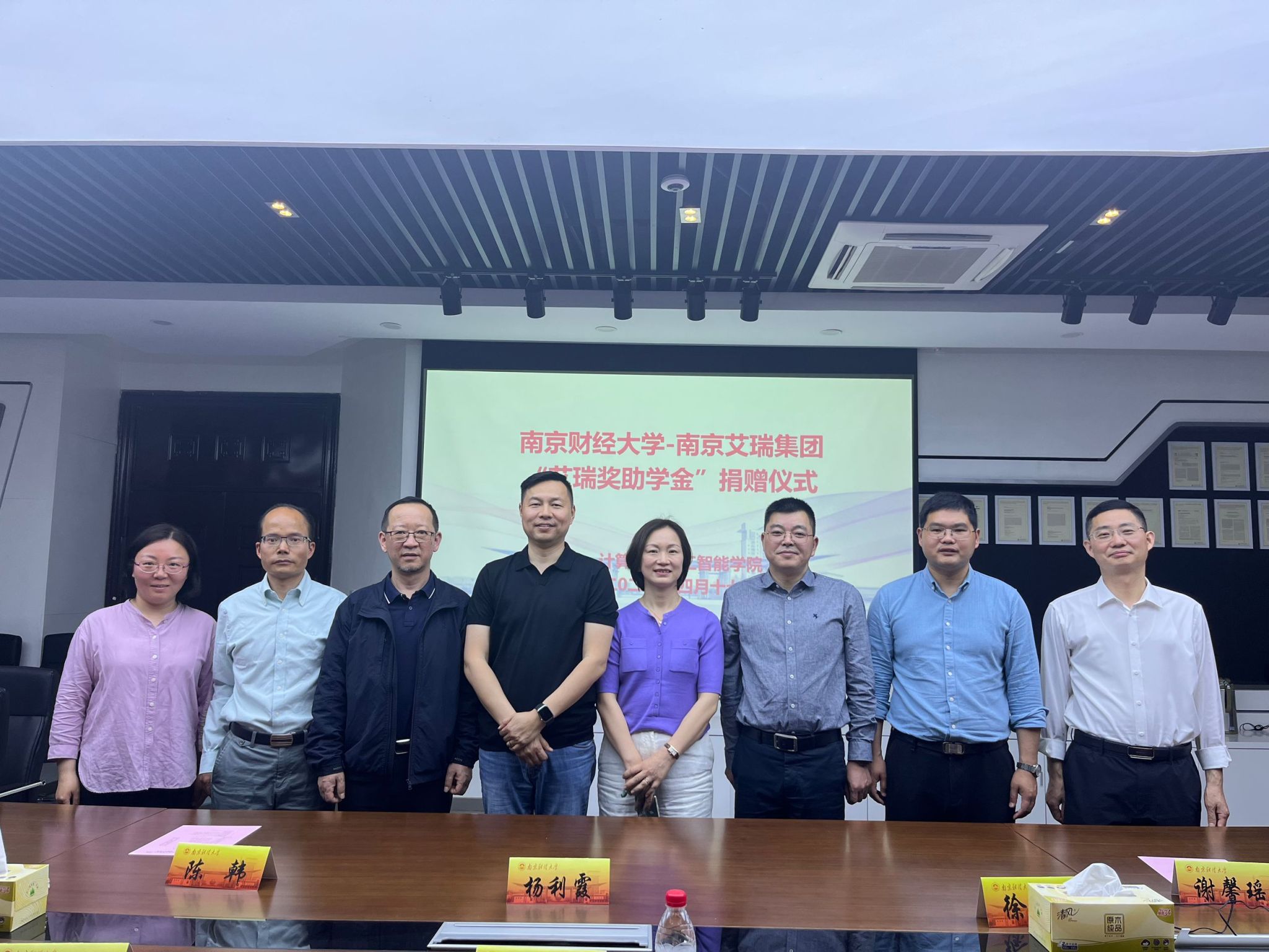 在仙林校区德业楼Z4-211会议室举行“艾瑞奖助学金”捐赠签约仪式。南京艾瑞集团董事长杨利霞、总经理徐彬、市场总监陈韩、项目专员谢馨瑶,南京财经大学对外联络处处长陆明峰、副处长裴银伟,以及彩票论坛