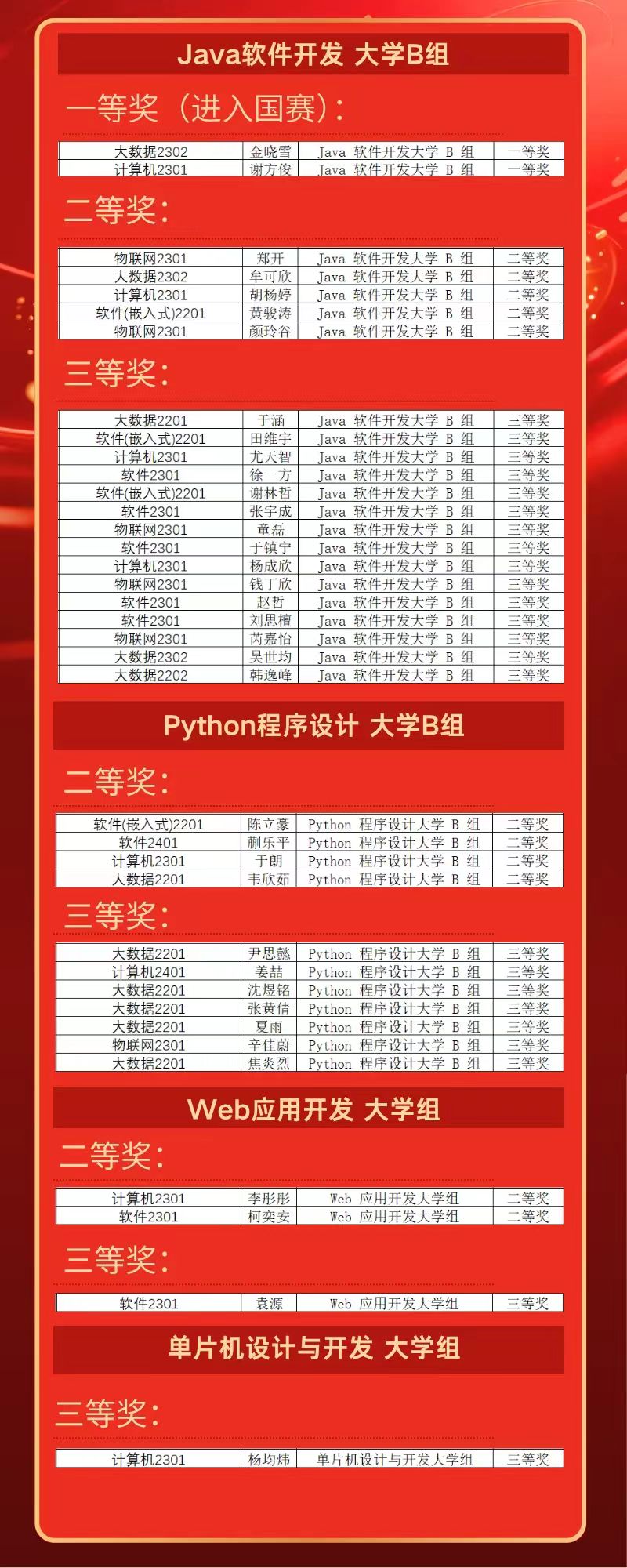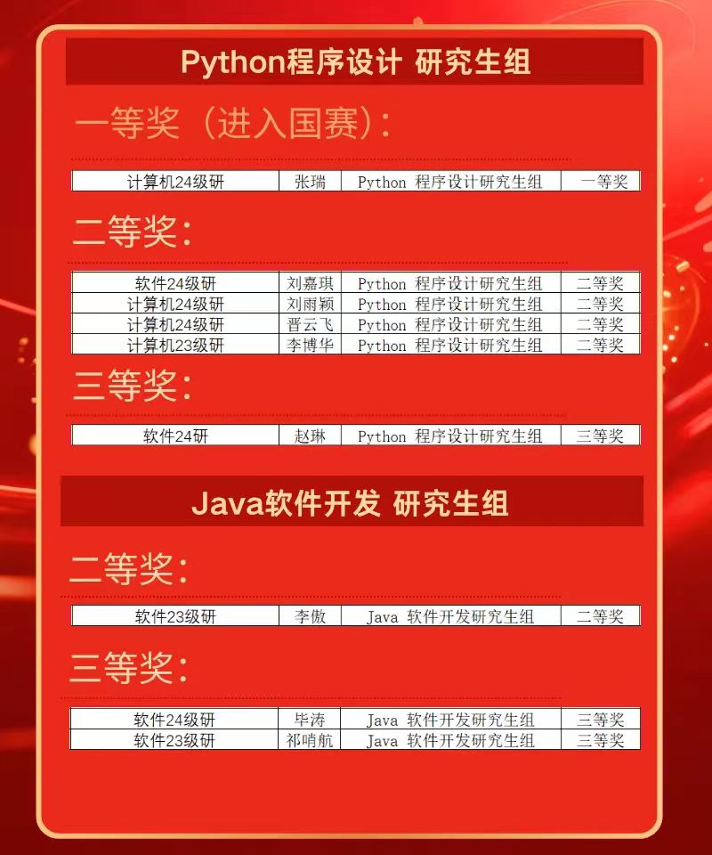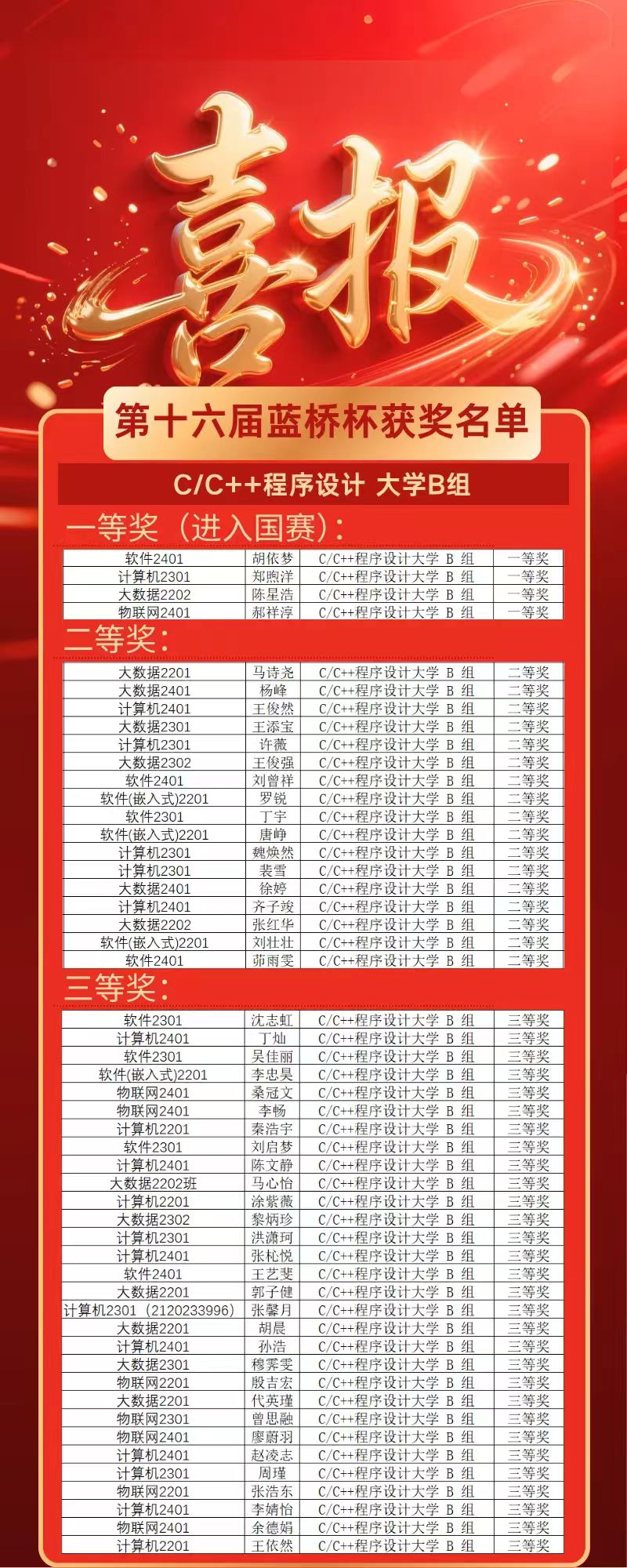 近日,第十六届“蓝桥杯”全国软件和信息技术专业人才大赛(软件赛/电子赛)省赛成绩公布,彩票论坛 共有100名学生获奖,其中一等奖9人、二等奖33人、三等奖58人,获C/C++程序设计大学B组一等奖的付学强、胡依梦、郑煦洋、陈星浩、郝祥淳、张轶博,获Java软件开发大学B组一等奖的金晓雪、谢方俊,以及获Python 程序设计研究生组一等奖的张瑞晋级国赛。