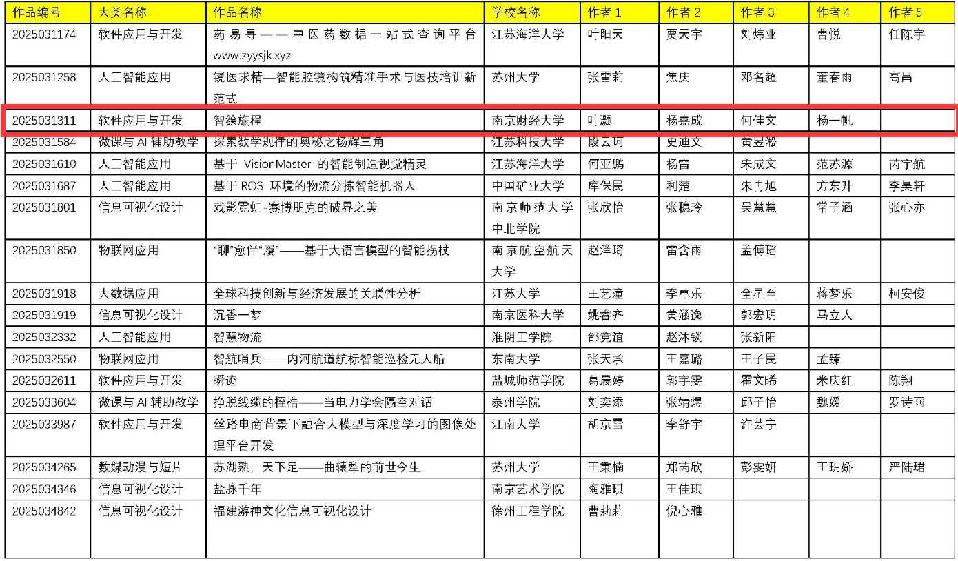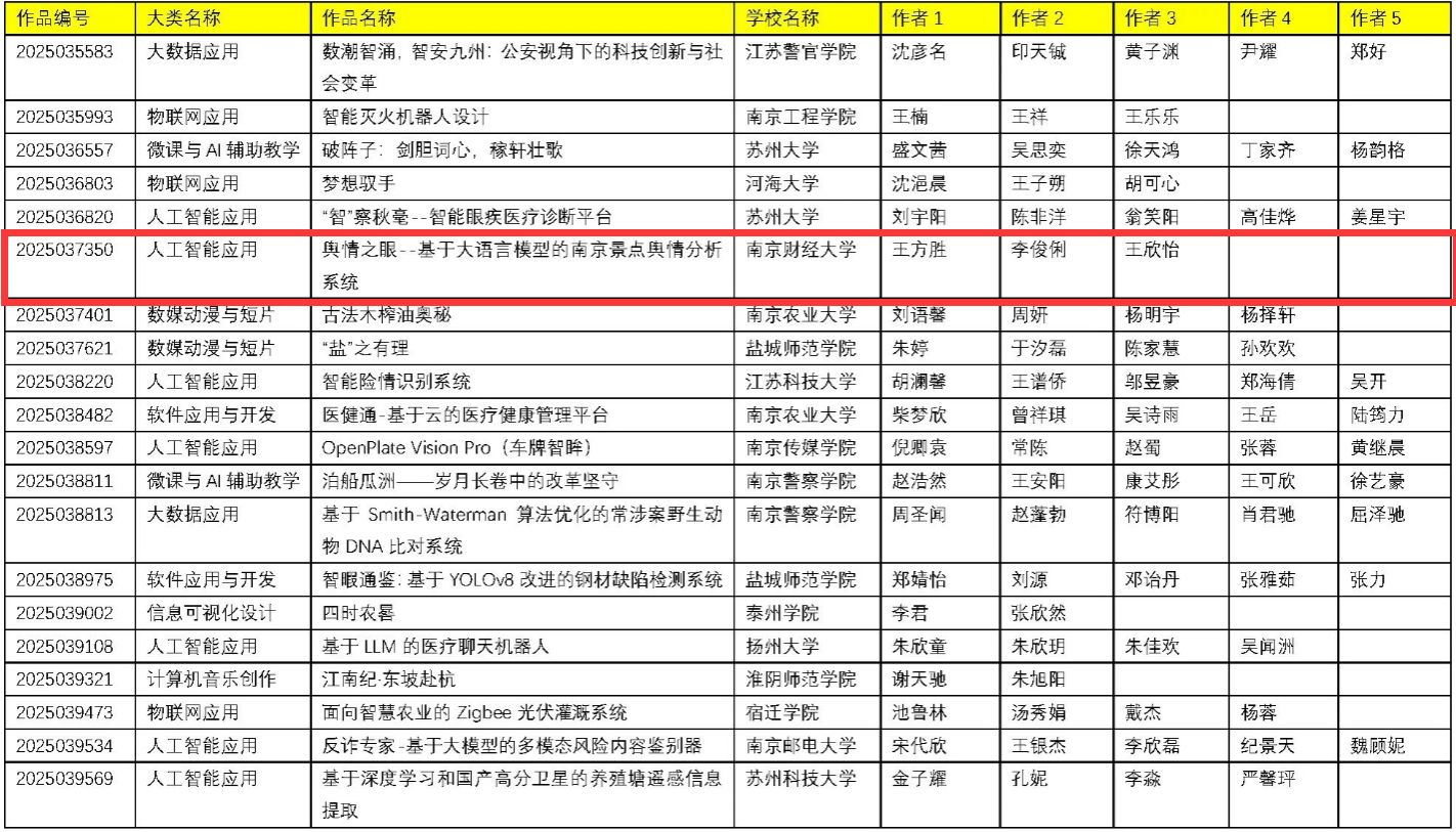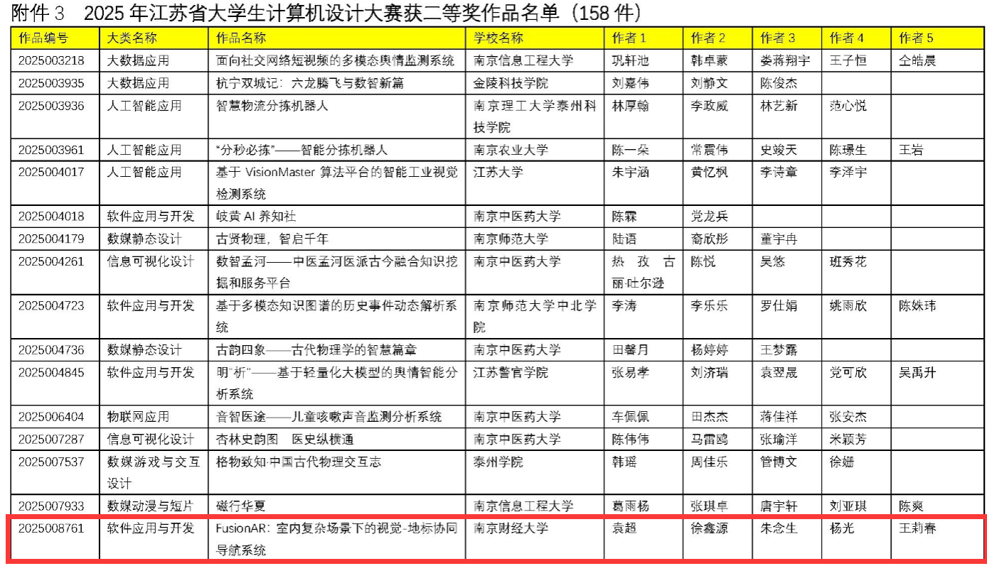 袁超、徐鑫源、朱念生、杨光、王莉春同学的《FusionAR:室内复杂场景下的视觉﹣地标协同导航系统》(指导老师:朱利涛)项目斩获二等奖,晋级国赛;王方胜、李俊俐、王欣怡同学的《舆情之眼——基于大语言模型的南京景点舆情分析系统》(指导老师:朱桂祥)、代英瑾、张黄倩、杨迪越、胡晏子同学设计的《AI就业市场全景洞察:大数据视角下的人才供需分析与战略应对》(指导老师:蒋伟伟)、 叶灏、杨嘉成、何佳文、杨一帆同学创作的《智绘旅程》(指导老师:李树青)获得三等奖。这些作品选题新颖,紧密结合人工智能、大数据等前沿技术,展现了解决实际问题的创新思路,充分体现了彩票论坛