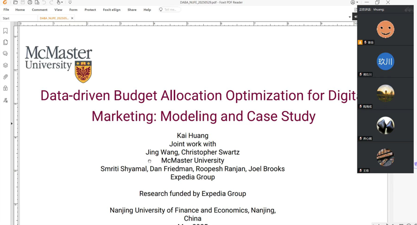 邀请,加拿大麦克马斯特大学黄楷教授通过腾讯会议平台带来题为"数据驱动的数字营销预算分配优化:建模与案例研究"的学术报告。本次讲座由黄健院长主持。