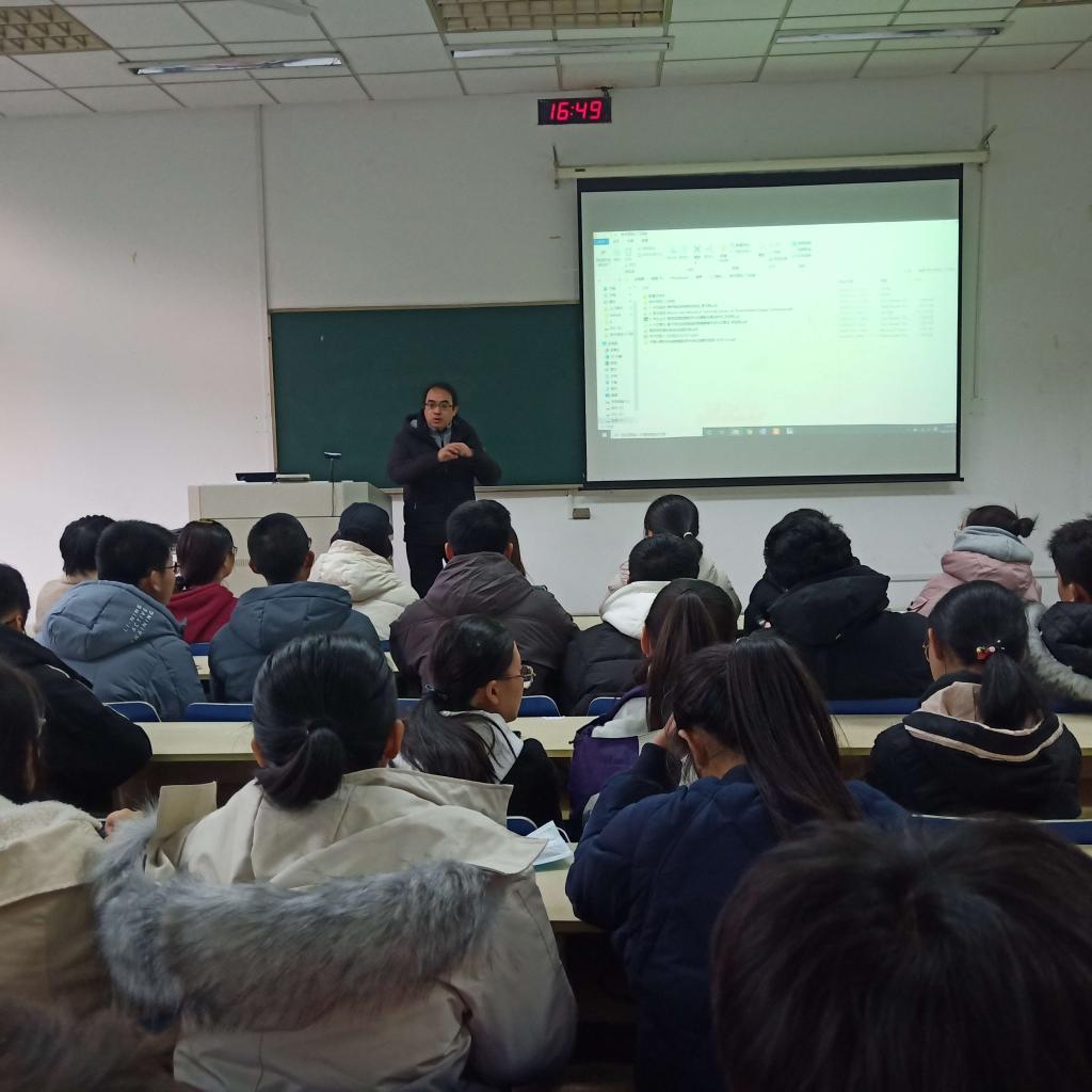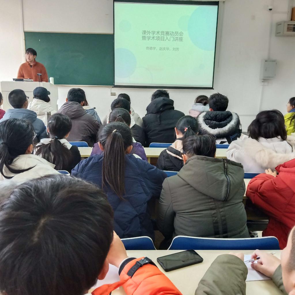 为20级学生开展课外学术竞赛动员会暨学术项目入门讲座。讲座由刘芳老师主持,佟德宇老师和赵庆华老师主讲。
