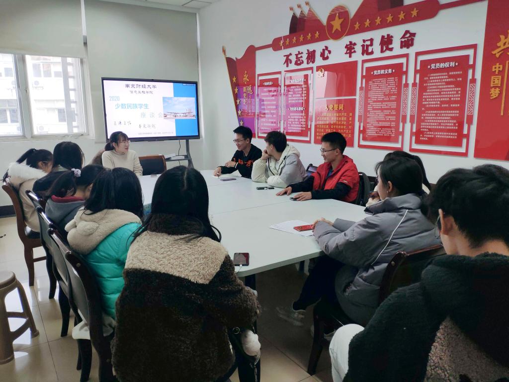 在这次谈话上,刘芳老师亲切地和同学们交流,耐心地询问大家上大学以来学习生活中是否遇到一些困难。同学们在老师的引导下敞开了心扉,大多数的同学们都表示:人际方面能够和同学、室友愉快相处,同学们都很热情温暖;学习方面也能跟的上,最近都在紧张的复习期末考试;生活上不习惯的主要是饮食方面,南京的饮食偏甜偏清淡,跟家乡口味大不相同。而当聊起自己的民族家乡时,同学们仿佛打开了话匣子,谈起自己家乡的特色美食,有贵阳的丝娃娃,有广西的米粉;谈起民族的特色节日,有壮族的三月三唱山歌,有水族的端节······刘芳老师表示,无论是哪个民族,大家本质上没有区别,同学之间要团结友爱,互相理解、尊重,共同成长进步,营造良好的学习、生活氛围。