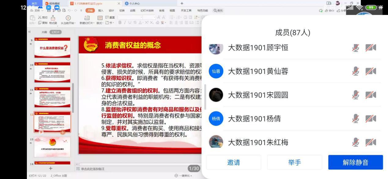 然后,主讲人抛出一个问题“何为消费者权益?”,接着向同学们详细解释并分析了这个概念,继而告知大家消费者享有的九大权力,普及了相关法律知识,让同学们有所收获。