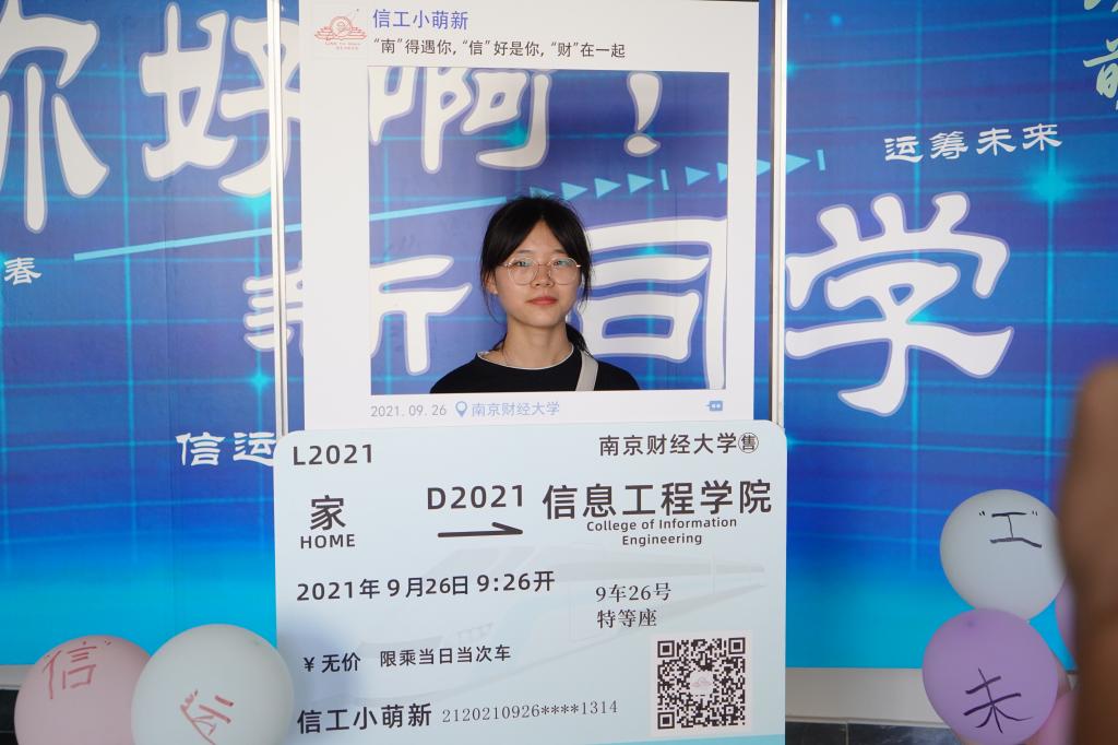 “信”好遇见你。学生会的学长学姐们特意制作的迎新朋友圈和寓意新征程的车票进行拍照,为大一新生留下大学生活的第一个影象。