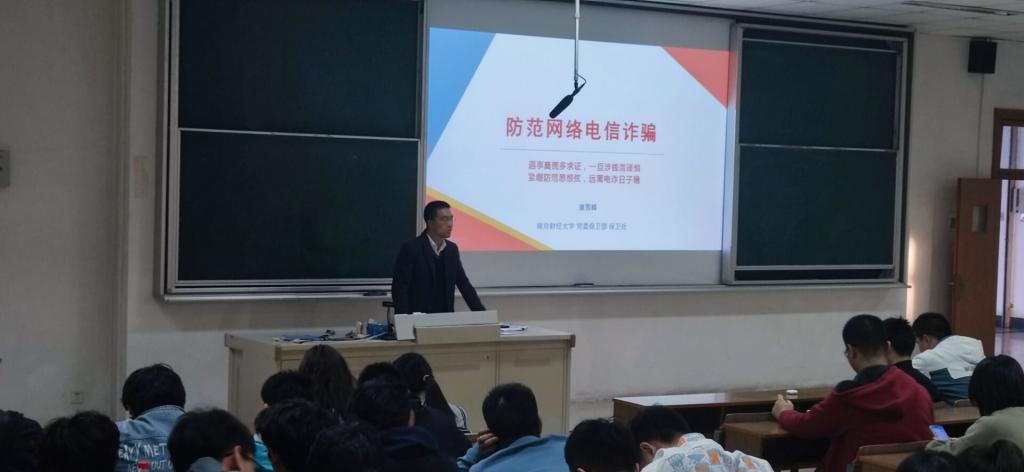 保卫处副处长潘雪峰以防范网络电信诈骗为主题,为同学们进行了深入讲解。