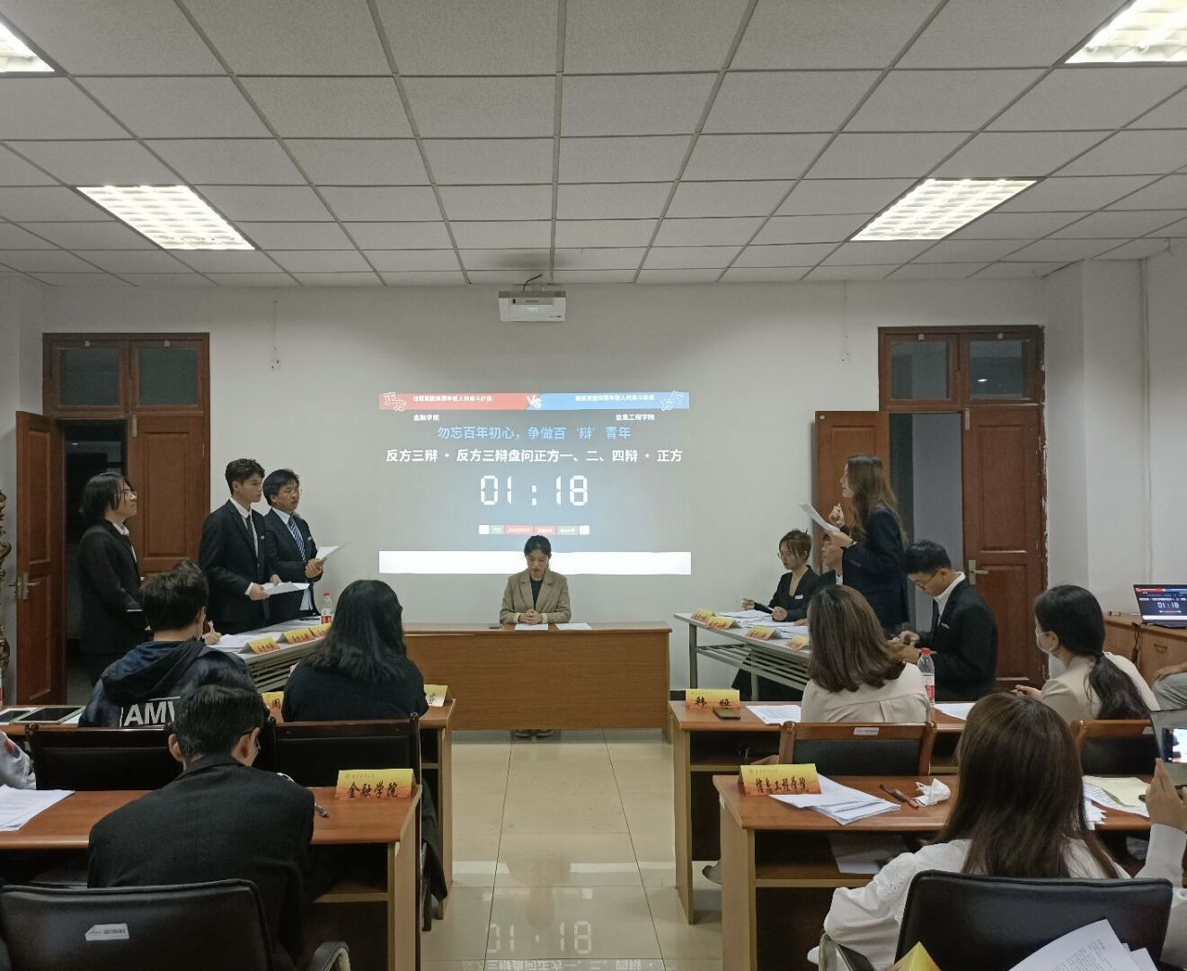 各派出12名辩手,围绕“佛系标签对年轻人成长利大于弊/弊大于利”,“二十一世纪青年做加法/减法更幸福”,以及“过程/结果更能体现年轻人的奋斗价值”三个辩题展开激烈辩论。双方辩手你来我往、侃侃而谈,场下观众激情澎湃、掌声连连。旁征博引间,辩手们争锋相对、妙语连珠,结合理论与数据充分论证了各自观点,彰显了智慧与才思的交锋、激情与勇气的碰撞。