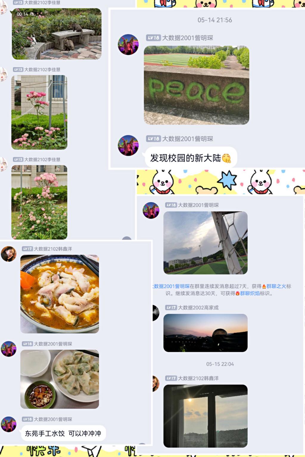 在为期21天的活动中,同学们将日常生活分享到QQ群里打卡,通过文字、照片、视频等形式记录下生活中的温暖瞬间,有同伴间互相帮助的图片,有展示小猫的画面,有表现对远方亲友关心与挂念的文字……同学们通过不同的方式记录暖心时刻,传播爱与善意。活动结束时,同学们还将自己打卡内容组合成各具特色的作品,与大家分享。
