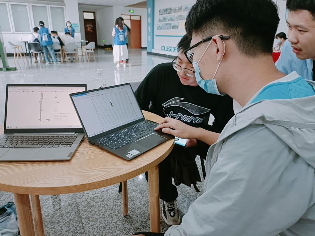 在“新”语言,“信”工人活动中。志愿者们打开电脑,邀请新生一起参与运行程序,用Python/Web编写代码来欢迎新生,新生也可以在志愿者的引导下自主运行出目标期望,以“码”为媒,串起南财新老“程序猿”心中别样的美。