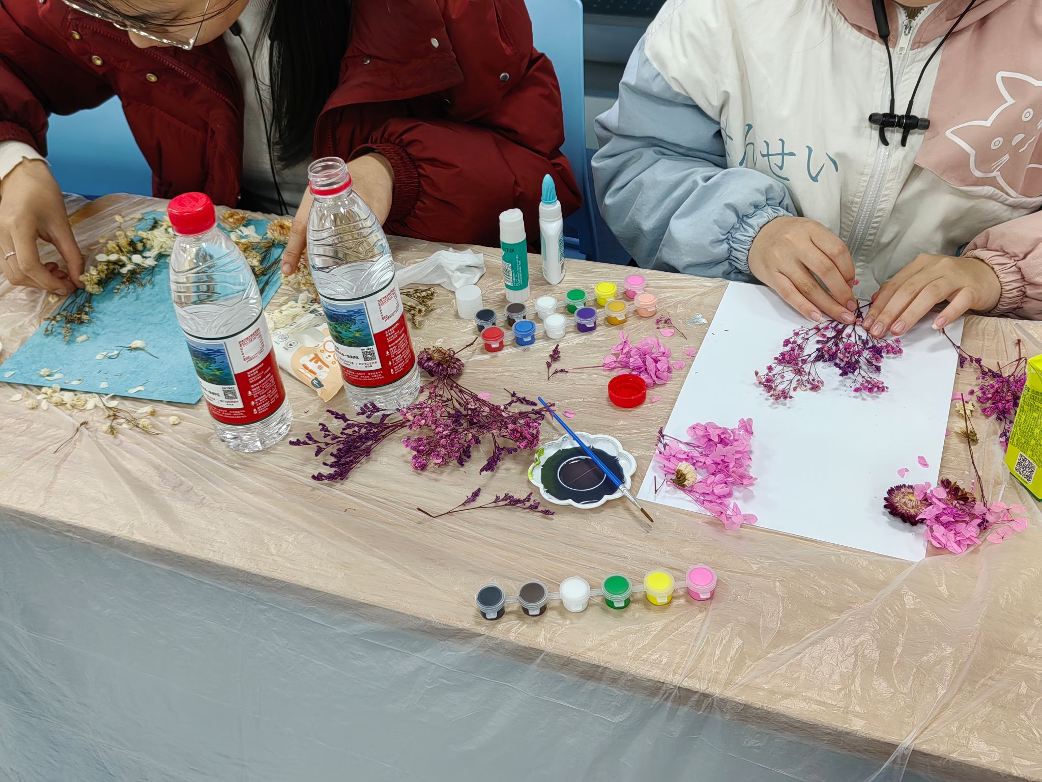 拼花创作环节以“春日校园”为主题,现场提供干花材料包和胶水等材料。同学们从构图、色彩搭配、主题契合三方面大胆创作,沉浸式地拼接创作自己心目中的最美春图,其中有的同学还以樱花与柳枝拼接出博文楼窗外的春景,获得现场同学们的称赞。