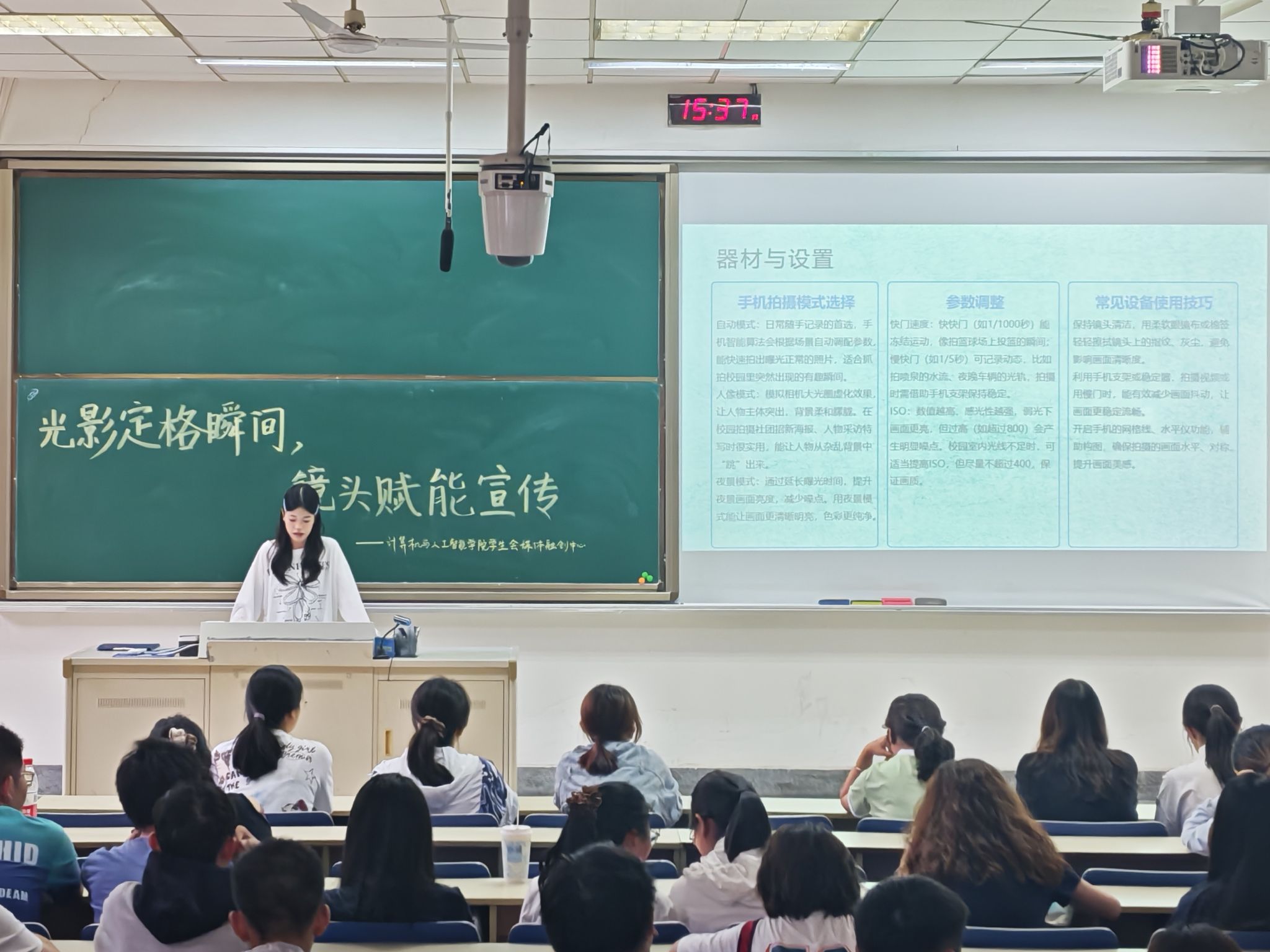 在德业楼101教室成功举办摄影培训活动。本次活动由学生会媒体融创中心组织,2025级全体学生会成员参加。