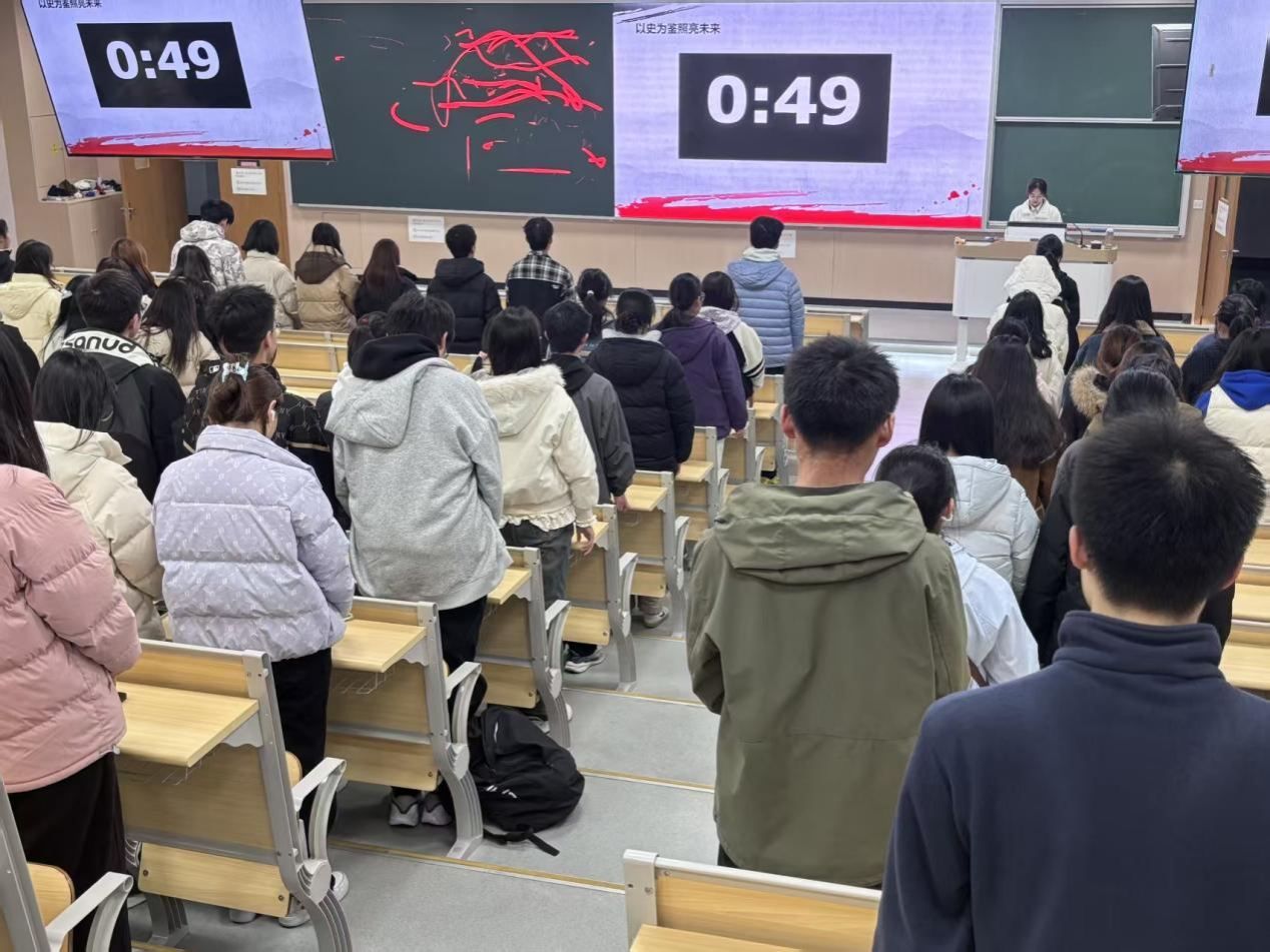 在仪式教育与集体记忆的环节中,主持人以沉静而庄重的声音宣布:“下面,让我们以最崇敬的心情,为所有在南京大屠杀及抗日战争中不幸罹难的同胞默哀一分钟,缅怀逝者,祈愿和平。”话音落下,屏幕上呈现出一分钟的倒计时,全体同学自发起立,垂首肃立,整个博观楼201教室瞬时陷入一片深沉而庄严的寂静。同学们神情凝重,眼神坚定,在静默中与历史对话,与逝去的三十万生灵进行着一场跨越时空的心灵祭奠。