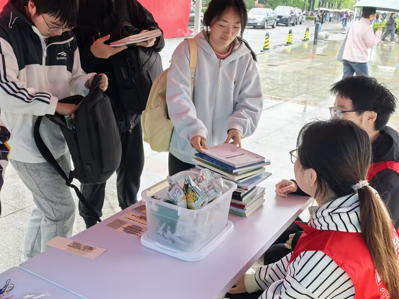 捐书换书区秩序井然。志愿者严格按照标准审核书籍,接收大学教材、正规课外读物,拒收中小学教辅、涂改破损严重及非法出版物,既确保书籍质量,也提升同学们的阅读满意度。同学们纷纷带来闲置的教材与课外书,或交换自己心仪的读物,或无偿捐赠助力公益。活动为无偿捐书的同学准备了纪念奖品,鼓励大家分享知识、传递爱心,现场氛围热烈而有序。