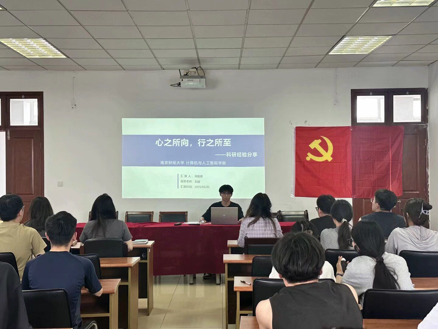 在第二部分,柯嘉晨同学结合自身科研经历,分享了如何调节学习状态、保持科研动力的经验。他指出,科研是一个长期积累的过程,学会平衡工作与休息、管理压力与情绪至关重要。他建议同学们通过制定合理计划、分解科研任务、适时运动调节等方式维持良好心态,并提醒大家“避免盲目比较,专注自身节奏,在持续积累中寻求突破”。作为一名学生党员,他鼓励大家以积极乐观的态度面对科研挑战,在攻坚克难中发挥党员的模范带头作用。
