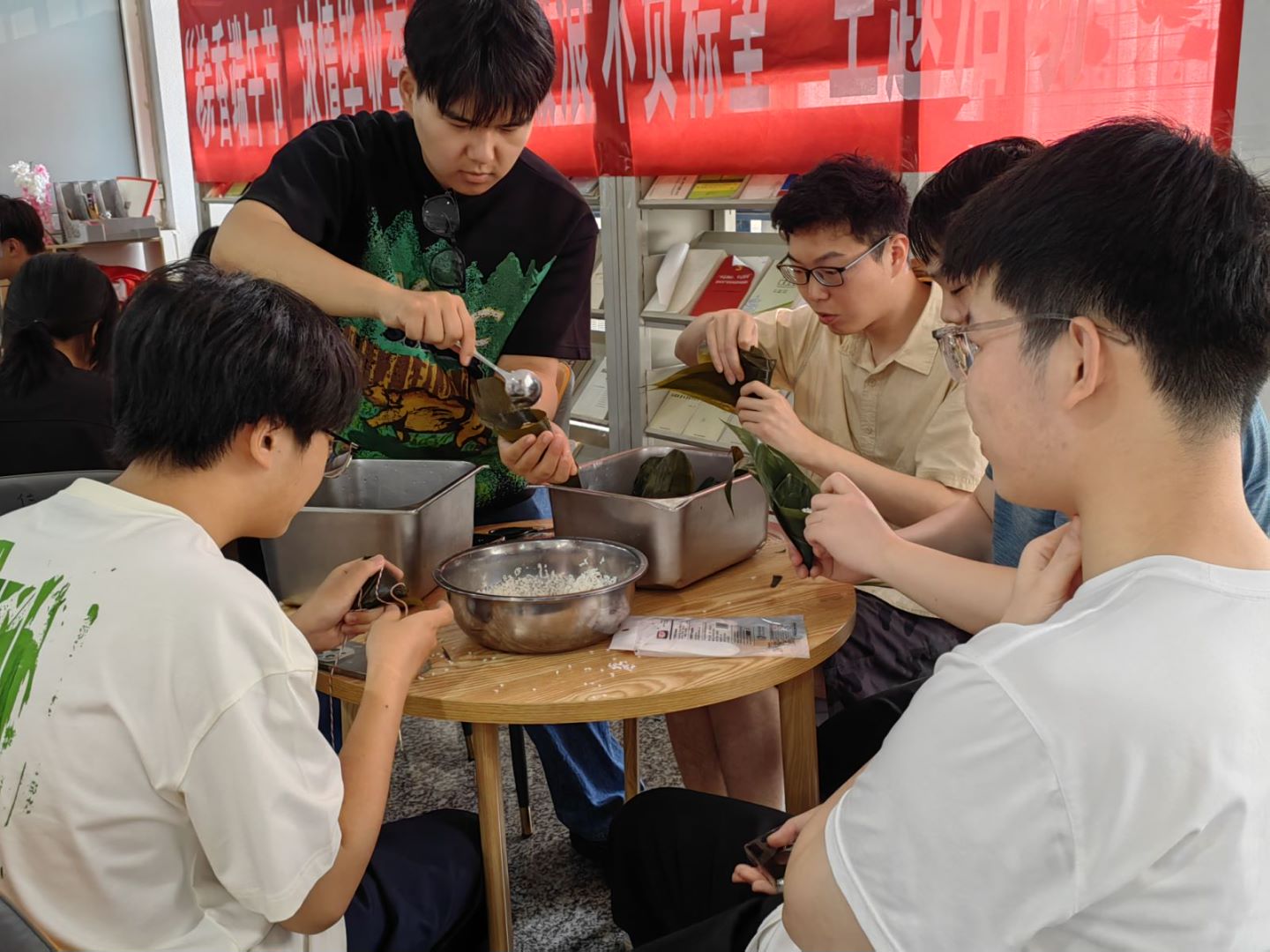 在包粽子小组,粽叶、糯米、蜜枣等食材早已整齐地摆在桌子上,经验丰富、动作娴熟的宿管阿姨现场指导,传授技艺。“粽叶做成漏斗状、填糯米、压紧实、封口、扎紧棉线”,毕业生们边听边实操,亲手体验了卷粽叶、填蜜枣、包粽米、系粽绳等环节。一边包着美味粽子,一边唠着家常;很多毕业生是人生第一次包粽子,“糯米漏出来啦”,“蜜枣应该放上面还是下面啊”……温馨的现场,温暖的一幕,笑声不断,一片融洽和谐。活动现场吸引了许多学生驻足观看,拍照分享。